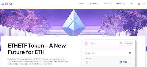 The ETHETF Token website states the coin’s intention to be ahead of the curve before BlackRock’s spot ETF is brought to the market, an event that is expected to cause a price explosion for Ethereum (ETH) and all coins associated with it.
